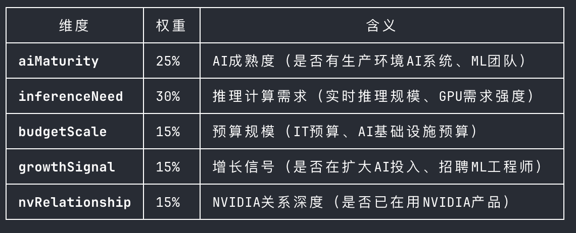 LLM对每家公司5个维度打分(1-5分),加权计算总分: